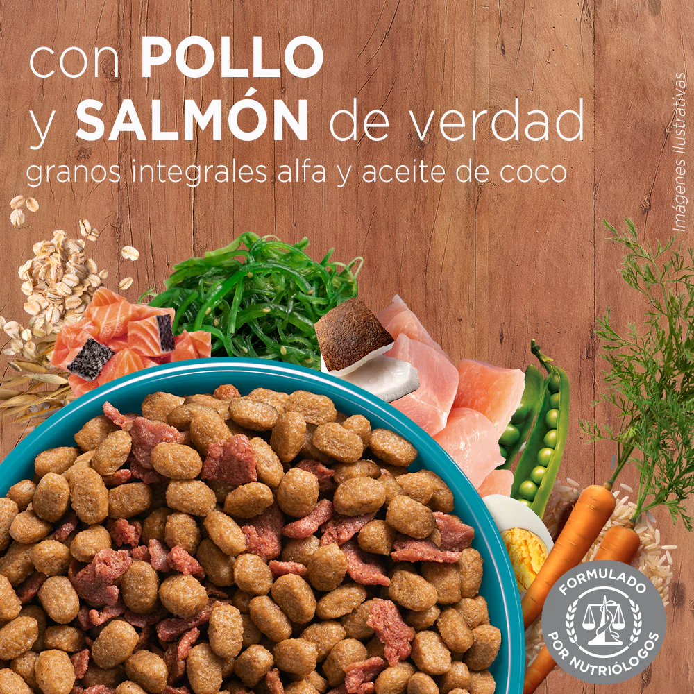 Carne de pollo y salmón congelados, maíz, harina de subproductos de pollo, trigo, harina de gluten de maíz, aceite de pollo y/o grasa vacuna preservados con tocoferoles (fuente de vitamina E), hidrolizado (polvo y/o líquido) a base de subproductos de pollo y/o cerdo, pulpa de remolacha, arroz, avena, sal, carbonato de calcio y/o fosfáto cálcico, colorante natural (caramelo), cloruro de potasio, zeolita, sorbato de potasio, cloruro de colina, suplemento vitamínico antioxidante (A, D3, E, K3, B1, B2, B3, B5, B6, B7, B9, B12, BHT), harina de alga (Schizochytrium sp.) y/o harina de pescado, suplementos minerales , DL-metionina, aceite de coco, ácido ascórbico (fuente de vitamina C), huevo en polvo, L-lisina, zanahoria deshidratada, arveja deshidratada.