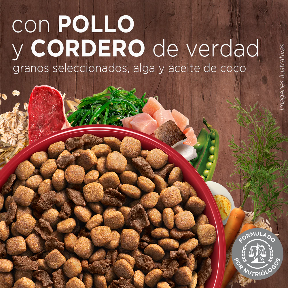 Carne de pollo y vacuna congeladas, maíz, harina de subproductos de pollo, trigo, harina de gluten de maíz, aceite de pollo y/o grasa vacuna preservados con tocoferoles (fuente de vitamina E), hidrolizado (polvo y/o líquido) a base de subproductos de pollo y/o cerdo, pulpa de remolacha, arroz, avena, sal, carbonato de calcio y/o fosfáto cálcico, colorante natural (caramelo), cloruro de potasio, zeolita, sorbato de potasio, cloruro de colina, suplemento vitamínico antioxidante (A, D3, E, K3, B1, B2, B3, B5, B6, B7, B9, B12, BHT), harina de alga (Schizochytrium sp.) y/o harina de pescado, suplementos minerales , DL-metionina, aceite de coco, ácido ascórbico (fuente de vitamina C), huevo en polvo, L-lisina, zanahoria deshidratada, arveja deshidratada, L-triptófano, L-treonina, taurina.