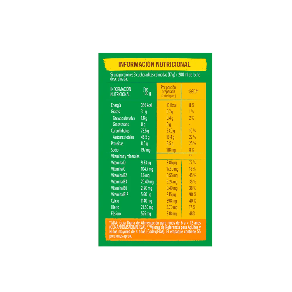 Fórmula fortificada con Malta, 6 Vitaminas (C, D, B2, B3, B6 y B12) y Minerales (calcio, hierro y fosforo) importantes para el crecimiento y desarrollo de los niños