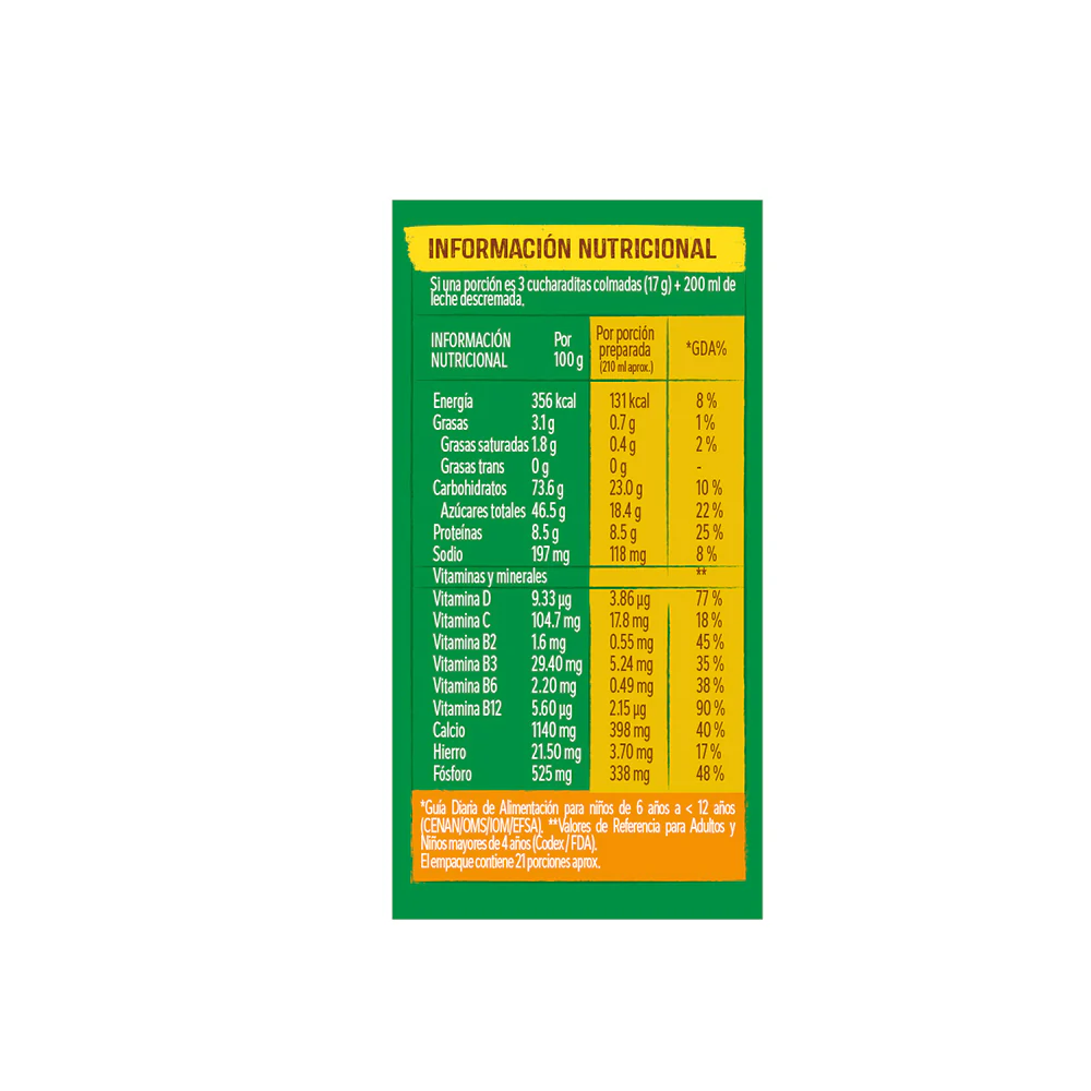 Extracto de malta (35%) [Cebada y Almidón de yuca], Azúcar, Leche entera en polvo, Cacao en polvo, Suero de leche en polvo, Minerales (Fosfato de calcio dibásico y Pirofosfato de hierro), Cloruro de sodio, Emulsionante (Lecitina de soya), Vitaminas (C, B3, B6, B2, D y B12), Regulador de acidez (Bicarbonato de sodio) y Saborizante